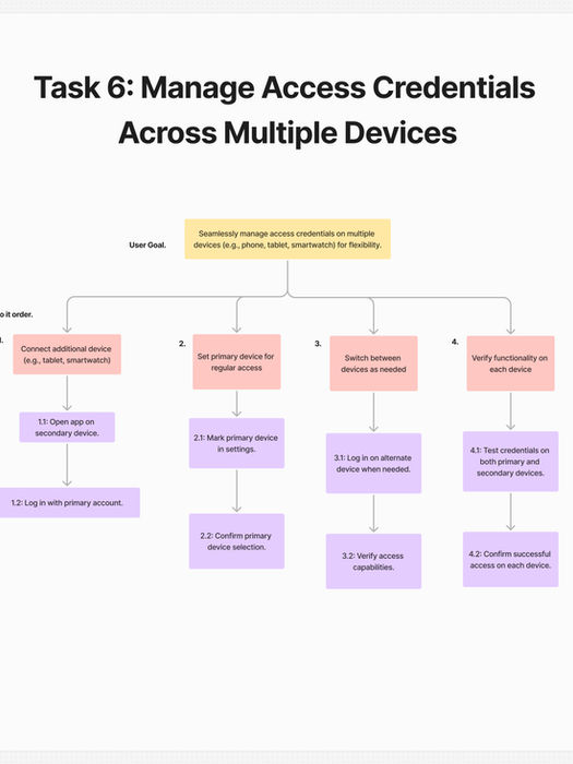 Based on our user interviews, we created a journey map for Allie, our persona, an employee unlocking her office door and managing visitor access. We found that while basic access was straightforward, visitor access was the task most users struggled with, often leading to confusion and frustration. This analysis helped us identify opportunities to simplify the process and improve the overall experience.